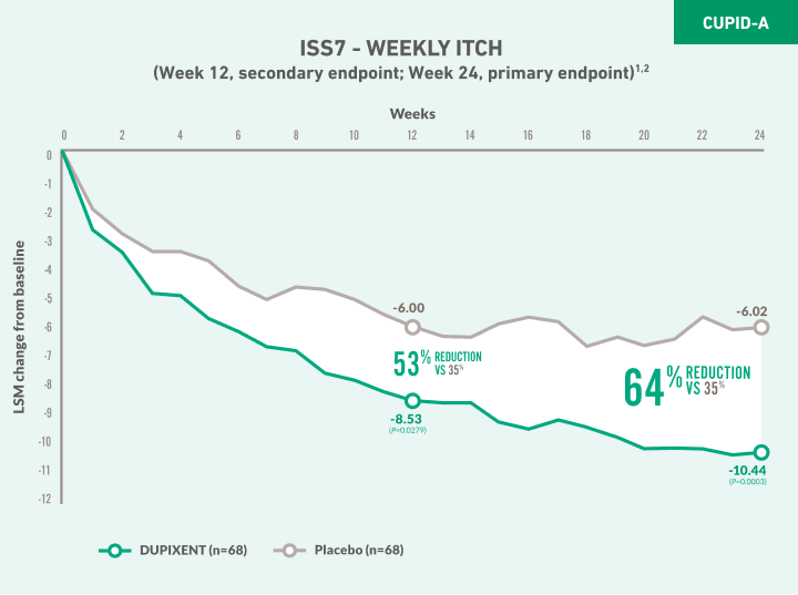 - 37% vs 28% reductiona in ISS7 at Week 12 (DUPIXENT: -6.98 vs placebo: -5.34, secondary endpoint; not significant)2