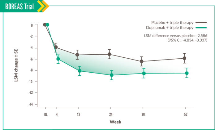 Change in Impacts score was seen at Week 52, with LSM difference vs placebo of -3.261 (95% CI: -6.007, -0.515).